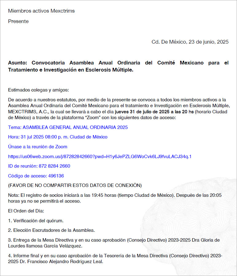 MEXCTRIMS, A.C., la cual se llevará a cabo el día jueves 31 de julio de 2025 a las 20 hs (horario Ciudad